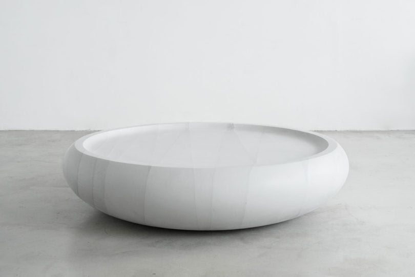 Ghost is a trio of minimal pieces of furniture, including a dining table, coffee table, and console, that are all cast in cement. Mastrangelo developed a technique over time that utilizes a robotic arm to form these smooth finished pieces made of carved cement.