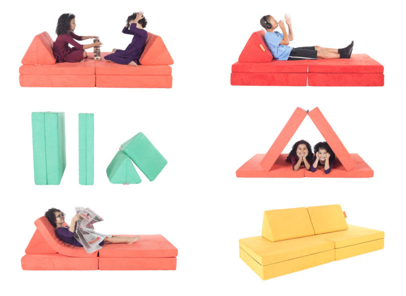 This set of four foam elements (1 sturdy folding base, 1 soft folding seat cushion, and 2 supportive pillows) can be arranged to form a sofa, bed, lounger, tent, or any variety of other configurations of forts a kid wants to build. Nugget is made to be furniture or to be used for play, but the options are limitless.